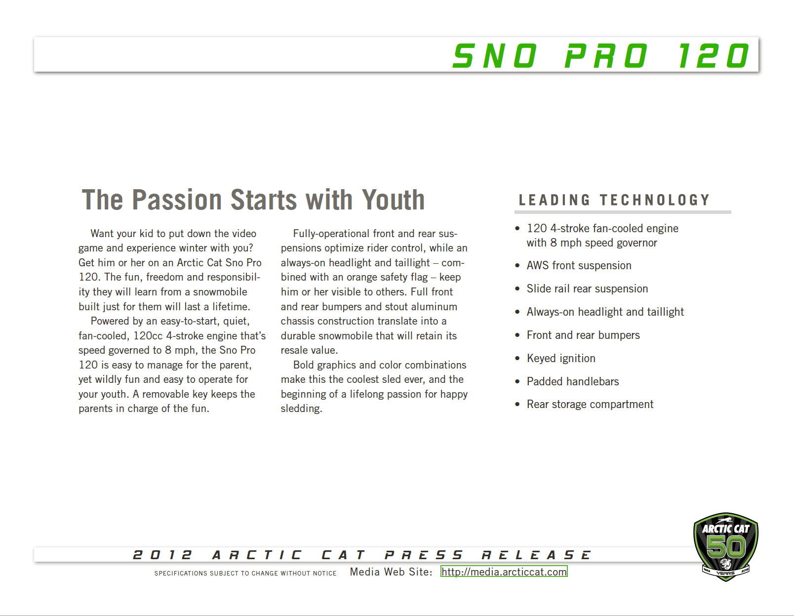 Home 2012 ARCTIC CAT SNO PRO 120 MEDIA KIT PDF