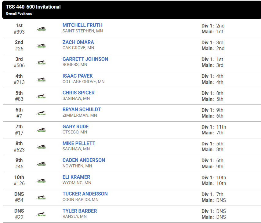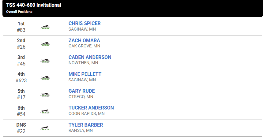 This image shows the thrilling racing action from the TSS Invitational in the 440-600 class at ERX Motor Park. Racers really pushed their Arctic Cat snowmobiles to the max on the tough, snowy track. The green Arctic Cat machines, favorites in both vintage and modern snowmobile racing, really stole the show at this event.
